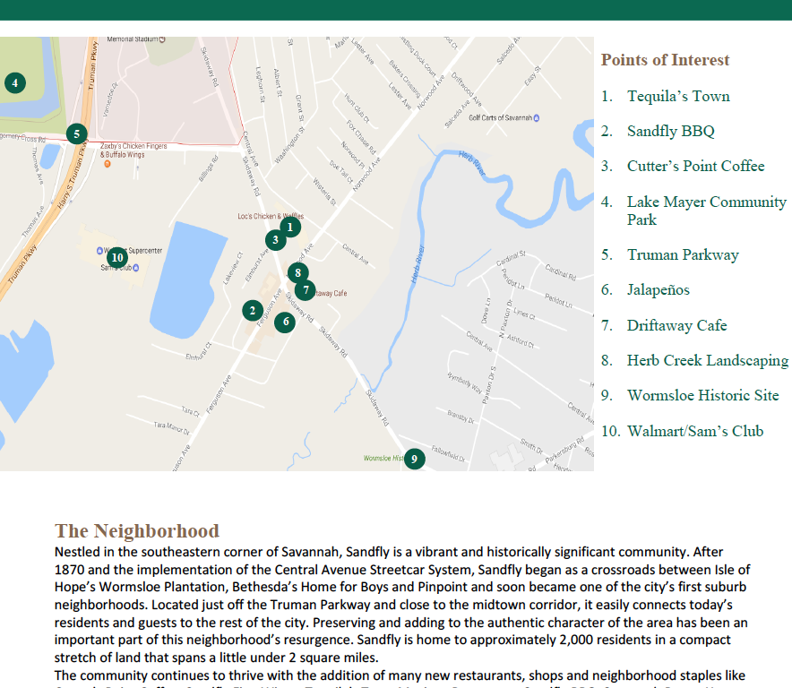 The community continues to thrive with the addition of many new restaurants, shops and neighborhood staples like Cutters Point Coffee, Sandfly Fine Wines, Tequila Town Mexican Restaurant, Sanfly BBQ, Savannah Power Yoga, August Made Boutique, Your Pie and Castaway's Cafe. Sandfly is a prime location for investment due to its proximity to Island communities like Isle of Hope. Dutch Island, Skidaway, Burnside and its quickly becoming the place to be with locals.